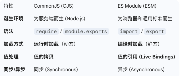 - ESM 导出的是值的引用:它像是一个只读的「窗口」。如果原模块内部修改了变量,外部通过 import 拿到的值会实时同步更新。