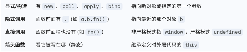 foo()):- 非严格模式:指向全局对象 (window 或 global)。