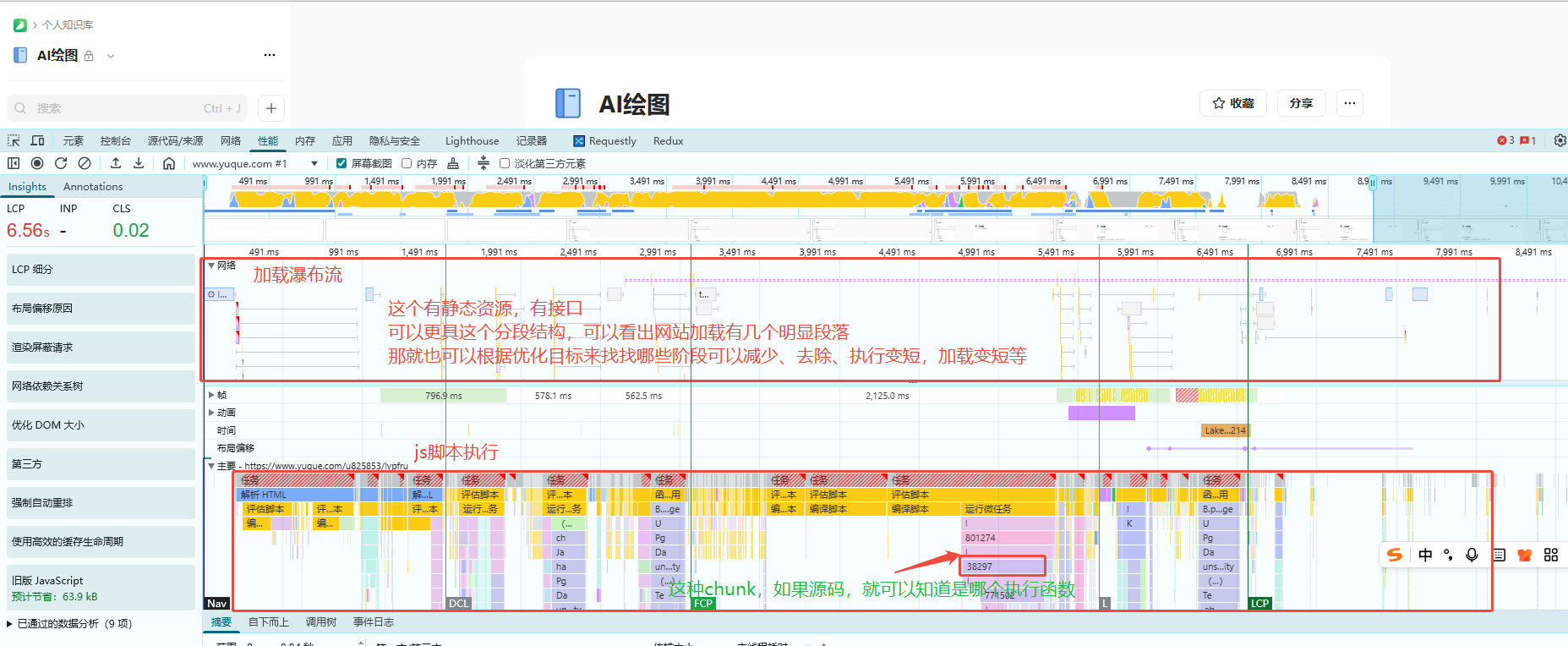 • 由于线上代码都是打包后的产物,它通常只能精确到某个 chunk 或某段长任务,很难直接定位到具体函数或业务模块,但非常适合做「大的问题定位」——比如先判断是接口拖慢了首屏,还是脚本执行和渲染占据了大头。