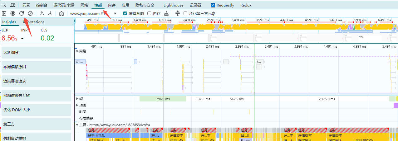 • 在本地开发模式下启动项目,针对具体页面做深度分析:网络瀑布、主线程耗时、长任务、渲染阶段、JS 调用栈等。